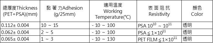 共同規格: Thin:0.05~0.06 mm ; Transmittance: 60%~89% ; Haze: 3%~30% ; Anti-static: ≦10^9-11Ω/sq ; Working temperature:140℃ - 190℃ ; RA pass:55℃~60℃/720 hrs