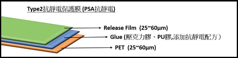 >Type1 抗靜電保護膜:藉由coating在PET表面的導電表面處理來解決靜電問題,好處在於可以使用不同膠來搭配。