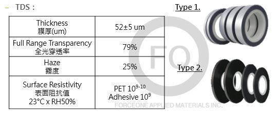共同規格: Thin:0.05~0.06 mm ; Transmittance: 60%~89% ; Haze: 3%~30% ; Anti-static: ≦10^9-11Ω/sq ; Working temperature:140℃ - 190℃ ; RA pass:55℃~60℃/720 hrs