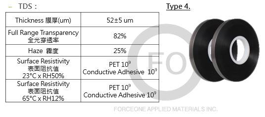 特殊規格:PET's anti-static: ≦10^5-10Ω/sq ; Adhesive anti-static: ≦10^9Ω/sq
